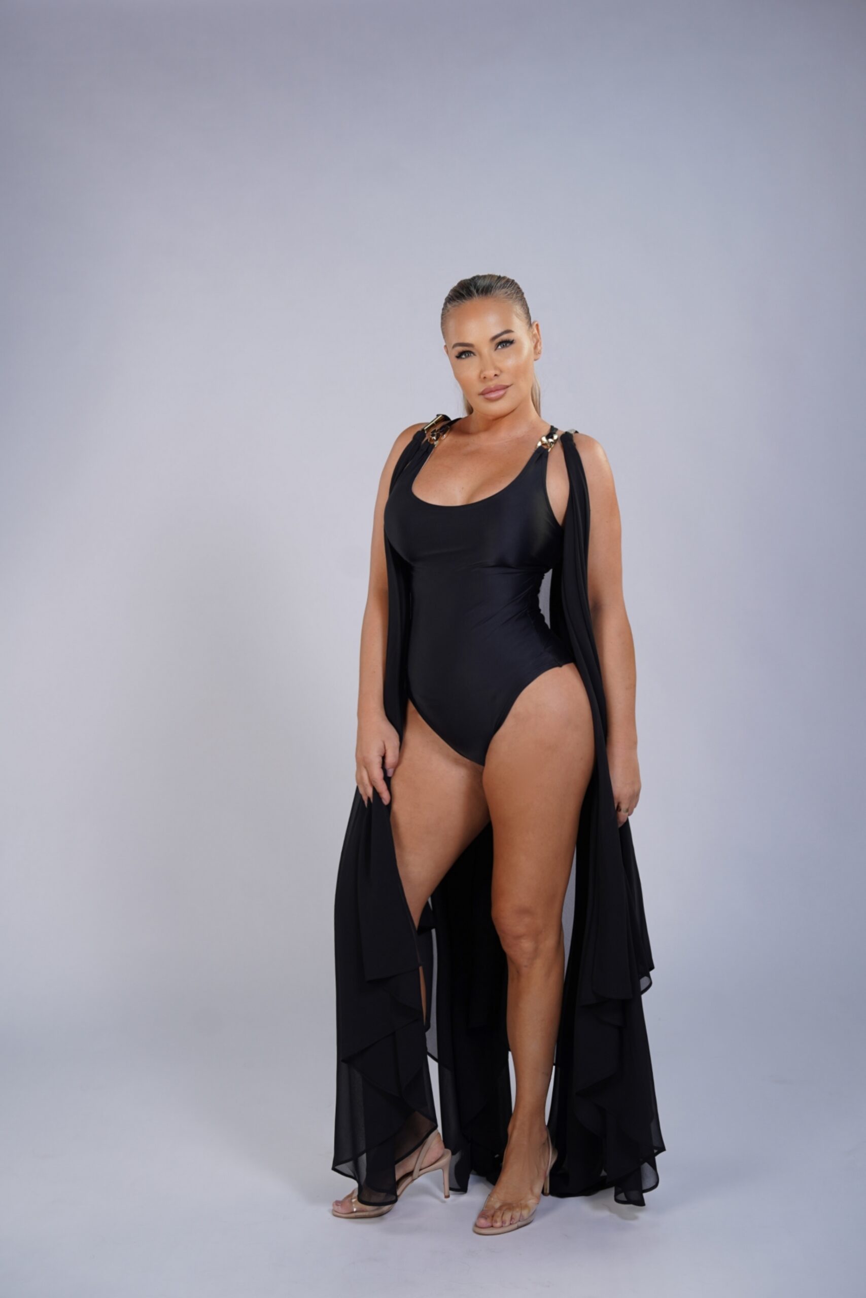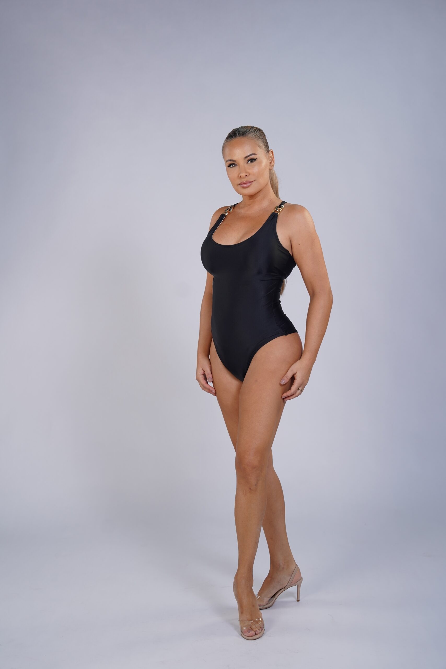 A timeless one-piece designed to sculpt and refine the silhouette with a clean neckline and structured straps. Crafted from high-compression Brazilian Lycra, it smooths the waist and hips while staying comfortable. Adjustable cross-back detailing adds subtle sensuality, perfect for elevated beach or resort wear.